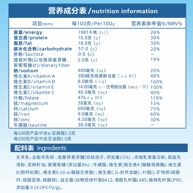 英致中老年益生菌羊奶粉是专为中老年人设计的一款产物。产物奶源纯净,混合天然营养素,搅拌当季新鲜草料,以42℃温水调和喂养奶羊,再以此优质羊乳为原料,经过喷雾干燥精制而成。